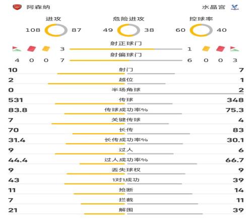 角球数据,阿森纳4次,水晶宫3次。过人数据,阿森纳9次尝试过人其中过人成功率44.4%,水晶宫6次尝试过人且过人成功率66.7%。